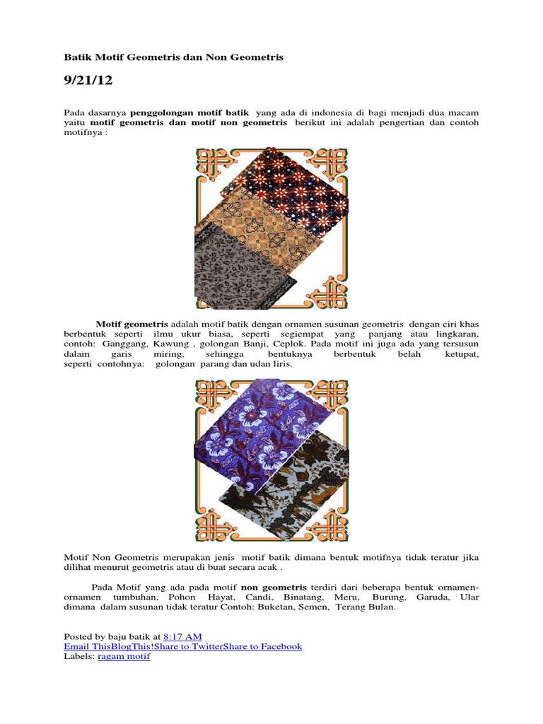 KURSUS DESIGN TEXTILE: CONTOH MOTIF BUNGA DAN BATIK from 4.bp.blogspot.com Warna yang digunakan tidak lain ialah biru tua, biru cerah. Motif mega mendung dikombinasi dengan motif hewan, bunga atau motif lain. Banyak macam motif batik mulai dari batik modern, batik nusantara, dan tapi kebanyakan motifnya bergambar batik dengan kombinasi bunga. Beberapa diantaranya mengenai pengertian/ apa itu motif batik pekalongan?, sejarah, ciri khas, makna, filosofi dan penjelasannya. Motif geometris merupakan motif batik dengan gambar yang berulang dan berbentuk bidang simetris. 10 ragam hias flora beserta dengan. Makna dari bunga lotus itu sendiri adalah melambangkan umur panjang dan juga kesucian. Batik sekar jagad merupakan motif batik yang sangat khas indonesia.
